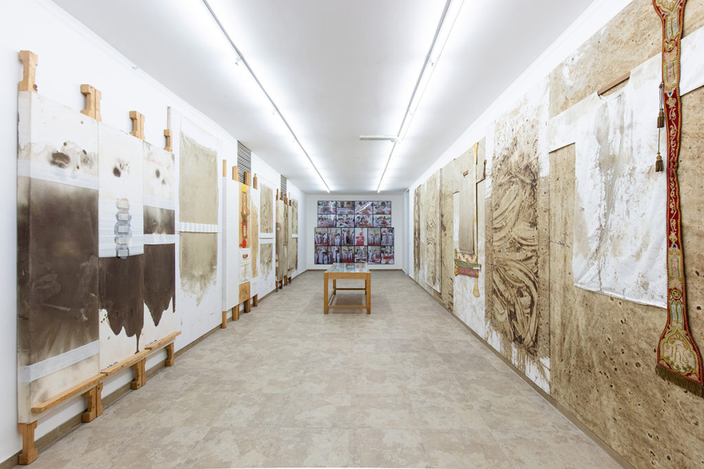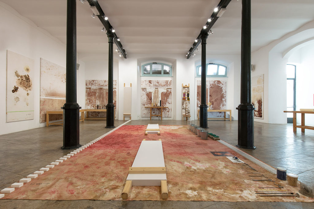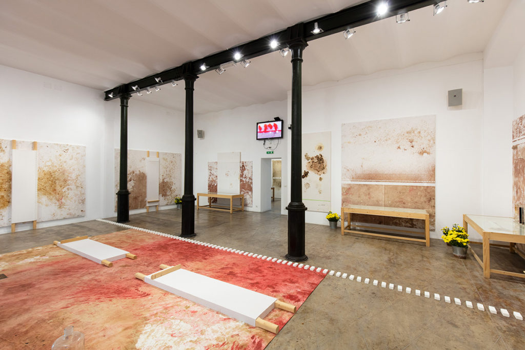 The 152.aktion featured a combination of the crucifixion ritual with the 77.malaktion, a pictorial action that produced the three large red canvases displayed in the central hall. At its centre, nine tables – ceremonially enriched with flasks, surgical instruments, pigments, tissues, white sugar, images and sacred vestments – are displayed as they were arranged in the original action.
