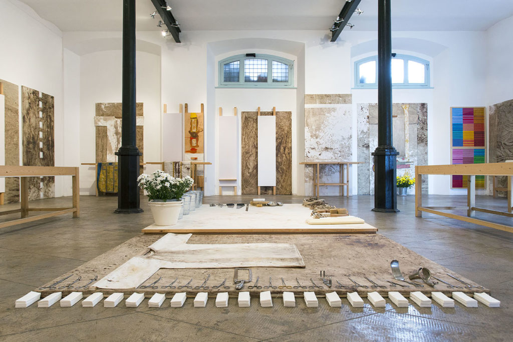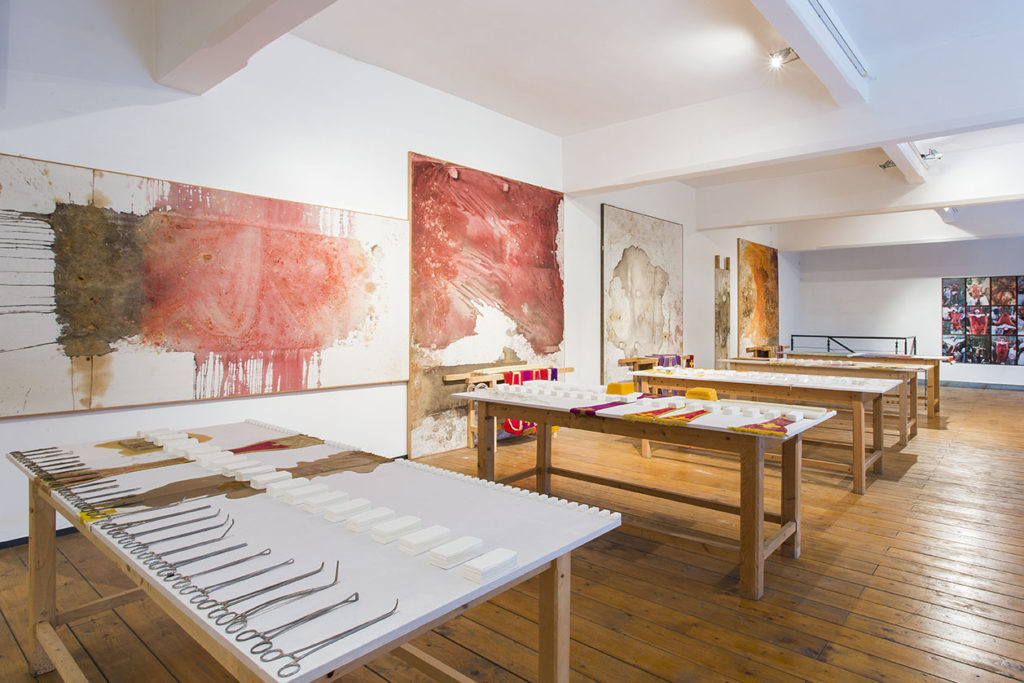 Il concetto che guida Arena – Opere dall’Opera va inteso, però, anche in maniera diversa. Una parte significativa del lavoro sui relitti consiste, infatti, in tavoli e in grandi pedane in cui, con una precisione cartesiana, vengono allineati ed organizzati materiali diversi, caldi gli uni e freddi gli altri, montando assieme le tracce del sangue e del materiale organico delle performance con il nitore limpido dei cubetti di zucchero o la perfezione glaciale e minacciosa degli attrezzi chirurgici. Nell’installazione di Arena – Opere dall’Opera lo spazio è pensato come un gigantesco tavolo metaforico al cui interno si collocano i diversi relitti e attorno a cui le pareti disegnano una altrettanto ideale “arena” per lo sguardo, diventando esso stesso un’opera.