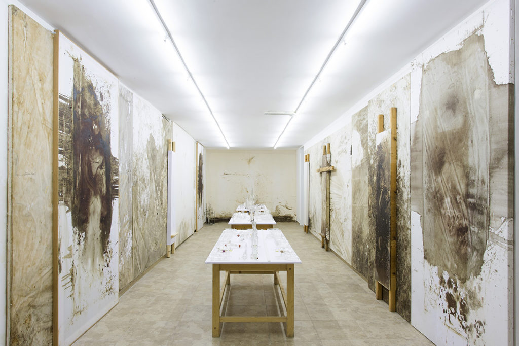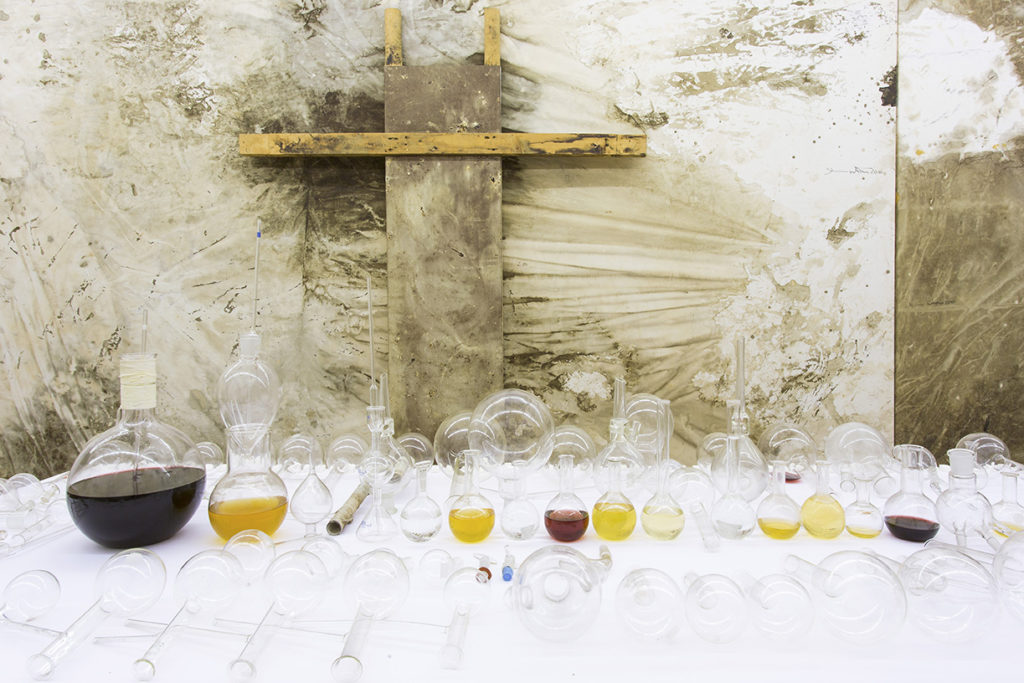 Si crea, così, un dialogo a distanza – ma intenso, fortissimo e imprescindibile – tra momento teatrale e momento visivo. È nella natura stessa dei “relitti”, l’essere traccia di qualcosa, testimonianza di un evento che è trascorso lasciando dietro di sé l’eco, enigmatica, della sua stessa esistenza. D’altro canto, per come li intende Nitsch, i “relitti” del Teatro delle Orge e dei Misteri sono anche una libera e autonoma costruzione, artistica e formale, che parte dalla testimonianza del fatto teatrale ma lo trascende. L’evento vivo e vissuto delle azioni non viene documentato dai “relitti” ma, letteralmente, riscritto; è opera in sé, in quanto teatro, ma anche materiale per una nuova opera, la quale agisce come momento di una silenziosa riflessione dopo il fragore estatico del rito teatrale.